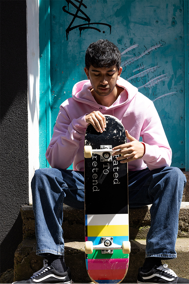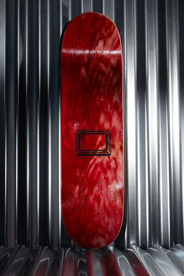 Skate deck with natural veneer and coloured top ply.